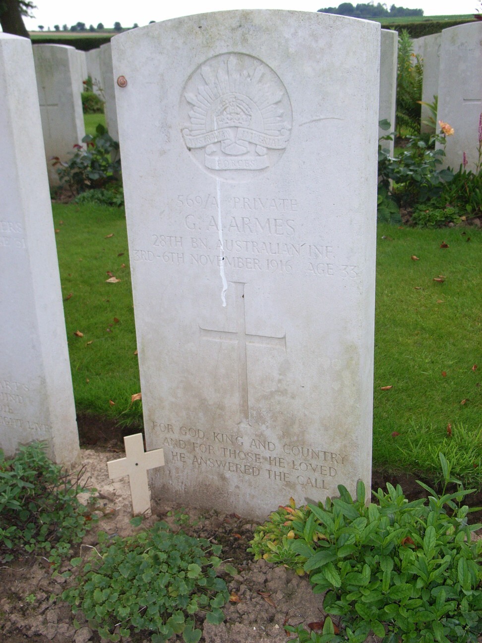 George arrived at Etaples France on the 16th October 1916 and joined the 28th Battalion at Flers on the 28th October. He did not have long to wait for action as in early November the 7th Brigade were tasked with capturing the German trenches at the position known as the Maze. In the terrible muddy conditions the 28th Battalion went forward on the 5th November 1916 and George was killed by a shell in No Man’s Land. His body was later found after the war, with a notation in his service record stating that he was buried 2 & ¾ miles S.W. of Bapaume.