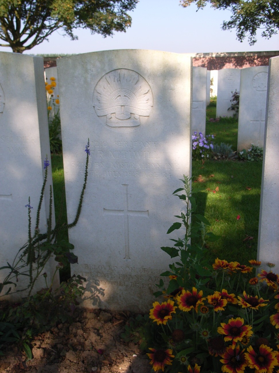In June 1918 he was promoted to Sergeant and the 32nd was engaged in vigorous patrolling against the Germans opposite them. On the 30th July 1918, the 32nd launched an assault on the Germans to capture a crucial piece of ground which needed to be taken before the British Armies launched their massive attack in early August. Unfortunately, Sergeant Frank Roy Attiwill was killed on the 30th July 1918. His body was recovered and buried at Beacon Cemetery Sailly Laurette in Plot IV.D.6. He is buried next to another Fremantle soldier of the 32nd Battalion, Pte Aldwin Burnett.