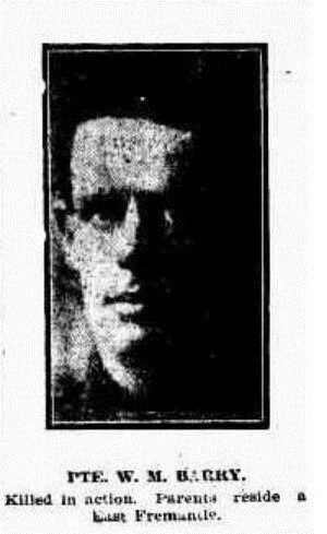 William Francis Barry was born in Northam Western Australia to William & Margaret Barry in 1893. The family soon moved to Fremantle where they took up residence in 68 Marmion Street East Fremantle. William attended Christian Brothers College Fremantle in Ellen Street though when he left school he took up work as a Labourer.