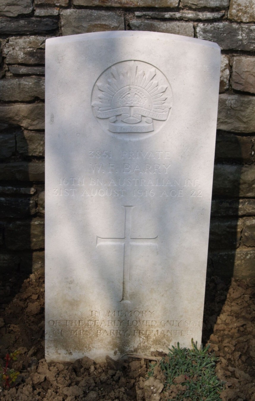 The 16th Battalion travelled north up to the region around Armentieres. They spent the rest of June and the early part of July in this area until they were relieved by the 5th Division AIF. In mid July they were sent down to the Somme battlefield and would continue the advance at Pozieres over ground won at a great cost to the 1st & 2nd Divisions. The 16th Battalion went into the line in early August and launches assaults towards the position at Mouquet Farm. Their early attacks gained some more ground, but they were soon relieved by the 1st Division. In late August the 16th again went into the line and made another assault against the German positions at Mouquet Farm. On the 31st August 1916 during one such assault, William Barry was killed.