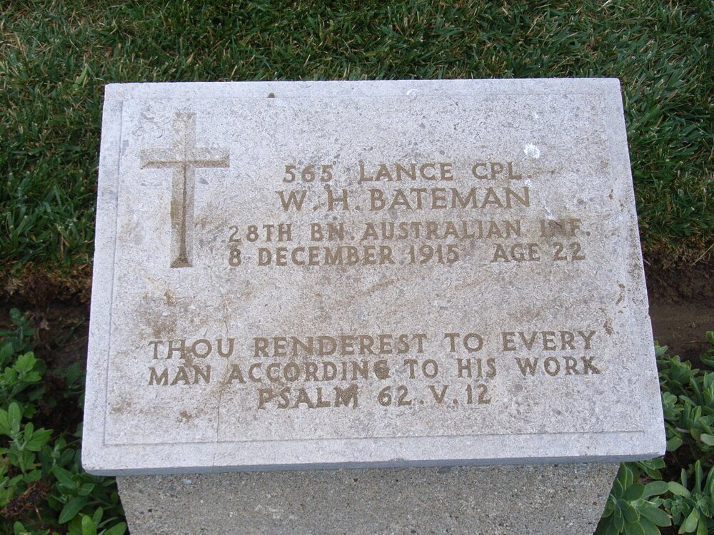 William Horace Bateman was born in Fremantle in 1893 to John Wesley & Mary Bateman. The family resided at “Sydenham” in Moss Street East Fremantle. Horace had four siblings, with Herbert (born 1885), Guy (born 1887), Vernon (1890), and Charles (1895). William attended Fremantle Boys School and Scotch College. He was working as a clerk after he left school. William enlisted in March 1915 with his brother Herbert. William was given the regimental number 565 and his brother William, 564. Herbert also joined C Company of the 28th Battalion AIF. His medical examination found William to be 5 feet 11 & ½ inches in height; weight of 155 lbs; chest measurement of 35-38 inches; grey eyes and dark brown hair. His religious denomination was Congregational. The 28th Battalion embarked from Fremantle on the 29th June 1915 aboard the H.M.A.T. “Ascanius”. While the battalion was training in Egypt, William was promoted to the rank of Lance Corporal. He embarked with his battalion from Alexandria on the 4th September 1915 aboard the “Ivernia”. The 28th Battalion arrived at Gallipoli in September after the majority of the main attacks were over. They were sent up to garrison the trenches in the newly captured territory around The Apex and Rhododendron Spur. Nevertheless casualties occurred at a constant rate as men were killed wounded or struck down ill. William was put into a beach fatigue party and worked to put stores on the beach and to take them up to the line. On the 8th December 1915 while on such duty he was killed instantly by a high explosive shell, one report saying that he was decapitated. William’s body was taken down and buried at N.Z. Point Cemetery (later Ari Burnu Plot H.2). He was buried and the service given by Canon H.S. Reid. His brother and some battalion mates were in attendance. His mother Mary received his personal effects and war medals and later penned an epitaph that would be inscribed on his grave at Ari Burnu Cemetery besides the Aegean Sea.