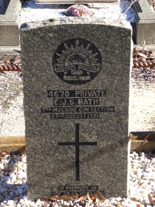 Edward John Sanders Bath was born in Gympie Queensland on the 27th December 1882 to Thomas & Elizabeth Bath. Edward had several siblings, with, William (born 1884), Walter (1886), Albert (1888), Ethel (1890), Henry (1893), Leslie (1895), William (1898) and Victor (1901). The family had moved from Queensland down to NSW and then across to WA. Edward was educated at Broken Hill NSW and later took up employment in Western Australia where he married Mary Ray in Coolgardie in 1905. They had several children, Ethel was born in 1905, Albert in 1907, Alfred in 1909, Cecil in 1911 and Ruth in 1913.