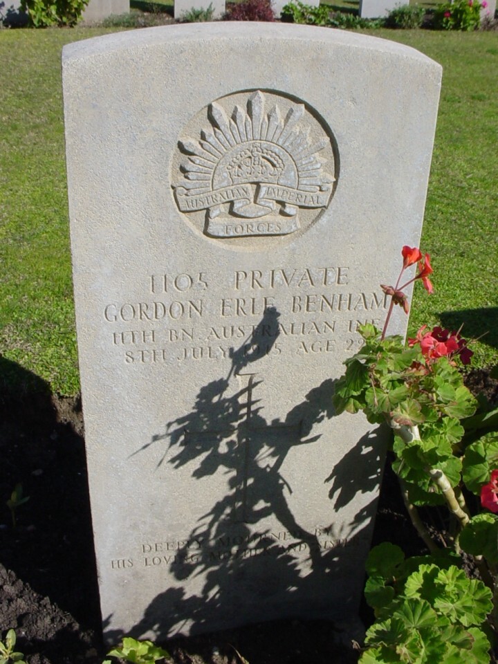 On April 25th Gordon landed with 11th Battalion at North Beach on the Turkish coast. He survived the landing and fought through all of May unscathed. On the 12th June he was taken to hospital but returned to the 11th Battalion two days later. On the 28th June 1915 Gordon was wounded in the right thigh by a Turkish bomb during a demonstration by the 11th Battalion against the Turks opposite. He was evacuated to the hospital ship “Sicilia” and taken back to Egypt. On arrival in Alexandria, Gordon was admitted to No.19 General Hospital though the wounds proved too severe to recover from and Gordon died on the 8th July 1915. Gordon Benham was buried in Alexandria in Chatby Military Cemetery Plot L.29