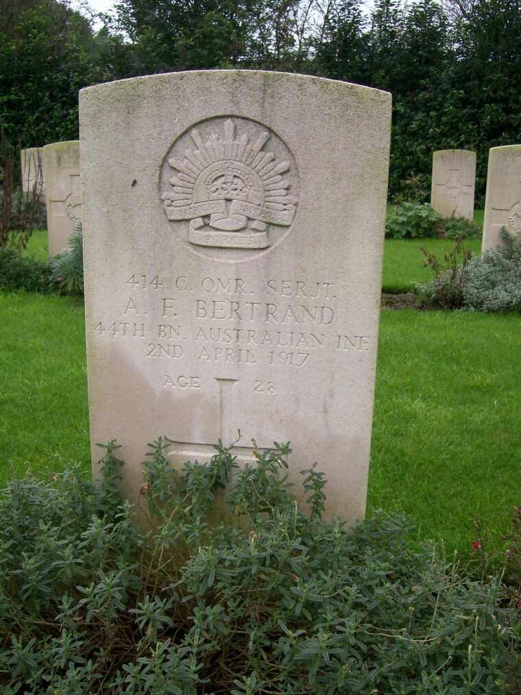 On the 2nd April 1917 Company Quarter Master Sergeant Alex Bertrand was killed in action by a German shell. There were eyewitness accounts of his death. Private E Brown of the 44th Battalion stated that;