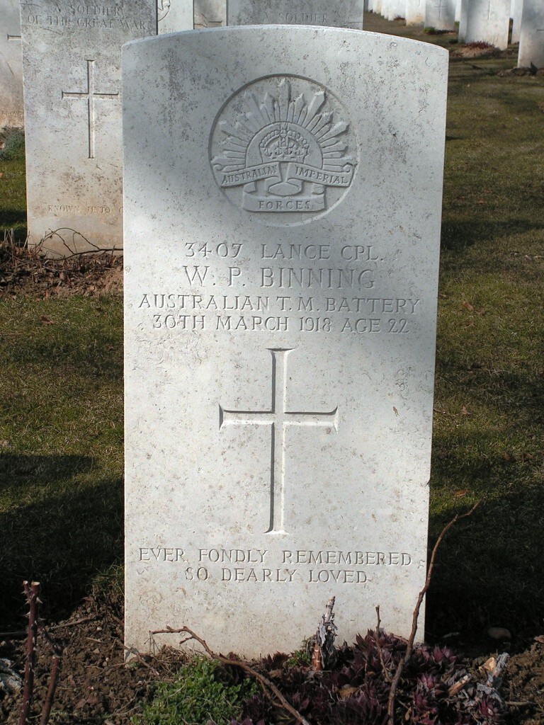 On the 27th February 1918 Walter was granted some much needed leave to England. He spent two weeks in ‘Blighty’ before going back to his unit on the 15th March 1918. A week later the Germans launched their massive March Offensive and broke through the Third & Fifth British Armies. The Australians were sent south to the Somme sector to try and form a line and repel the Germans. The 4th Brigade was sent to Hebuterne where they reformed the line with the help of New Zealand & British units. They stopped the German advance and retook some vital ground. On the 30 March 1918 Walter was killed in action during the preparation of a raid when a trench mortar shell prematurely exploded in the Stokes Mortar. Binning and two other men were killed by this explosion and were buried side by side east of Hebuterne.