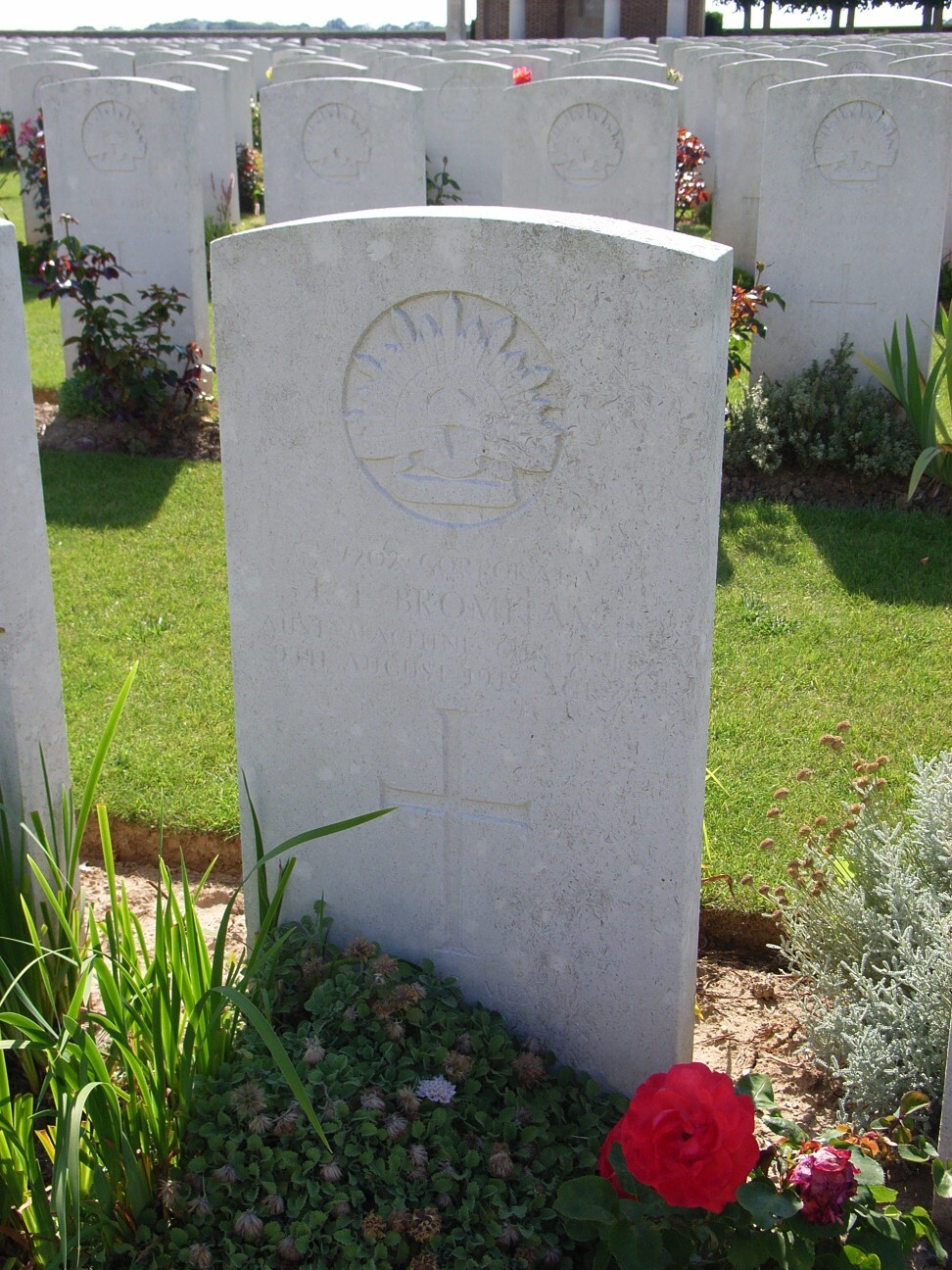 “At this time Bromham was a Corporal and when advancing on August 9th about 3pm at Harbonnieres I was within two yards of him when he was sniped through the forehead. {He} Dropped, killed instantly. At the time the body was left where casualty happened but was buried in a British Cemetery on the left of Harbonnieres and I assisted to erect a wooden cross with the Battalion colours on”.