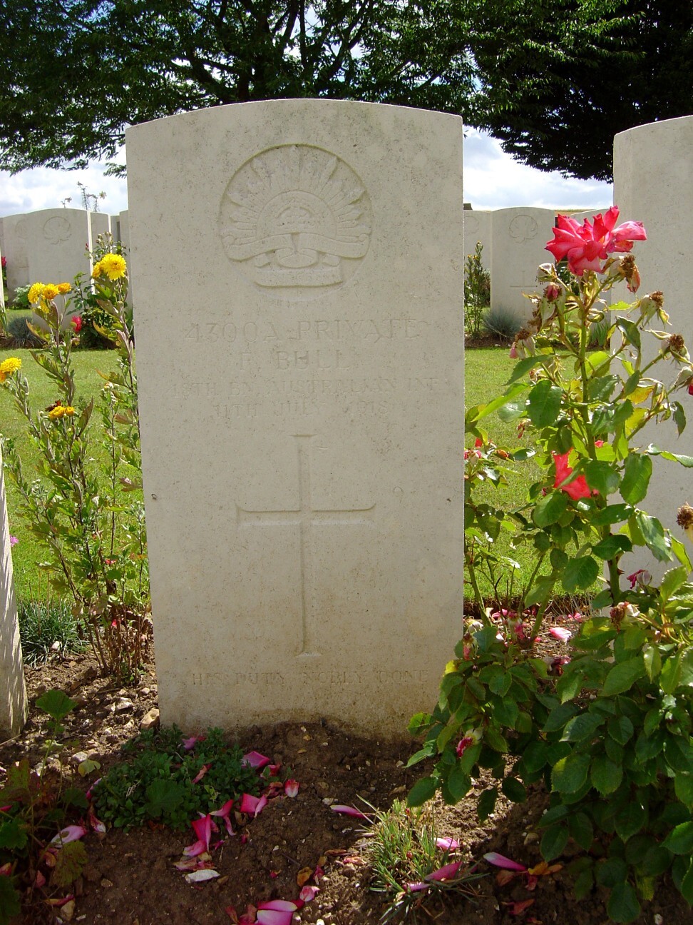 On the 4th July 1918 while the 4th & 11th Brigades assaulted and captured the village of Hamel, the 48th Battalion was nearby at Sailly-le-Sec and came in for much German shellfire. Fred was wounded in the buttocks and thigh by shrapnel and was evacuated by the 4th Field Ambulance back to the 5th Casualty Clearing Station. Fred hung on to life for 7 days but the wound proved too severe and he died on the 11th July 1918. He was buried in Crouy-sur-Somme Cemetery in Plot III.F.23