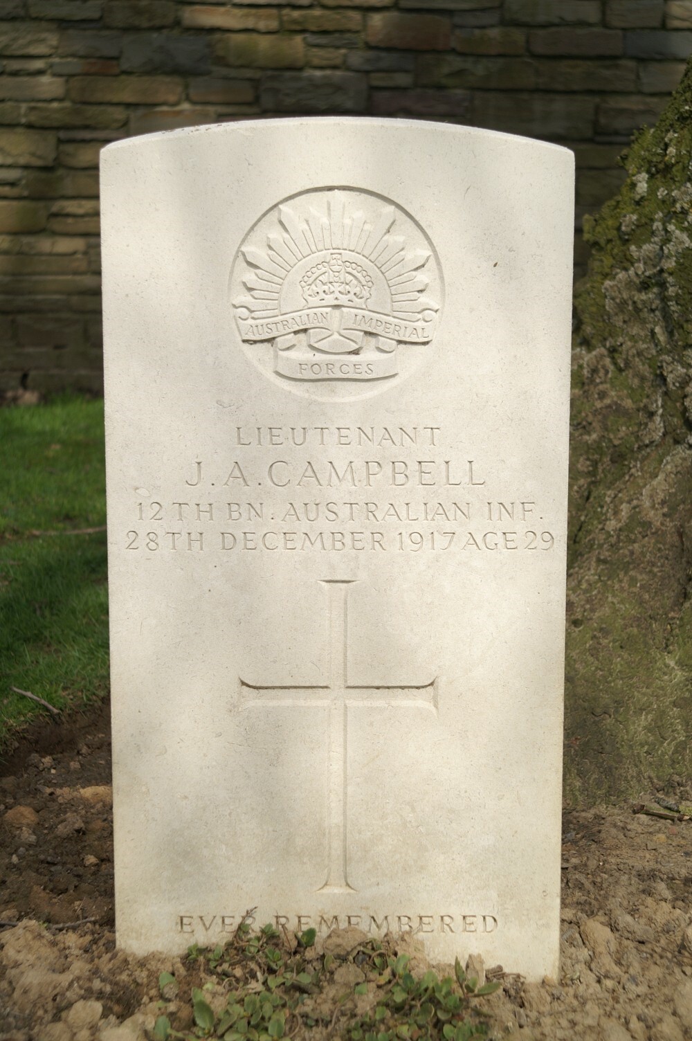 On the 28th December 1917 John was sharing a dugout with a Lieutenant P.T. Miller and Captain W.A. Connell of B Company when a German shell fell directly into their position, killing all three. John Campbell had survived the battles of Lone Pine, Pozieres, Mouquet Farm, Bullecourt and Ypres only to be killed by a lone shell on what the 12th Battalion war diary called the quietest sector they had been in. John was buried in Kandahar Farm Cemetery Belgium in plot II.H.5.