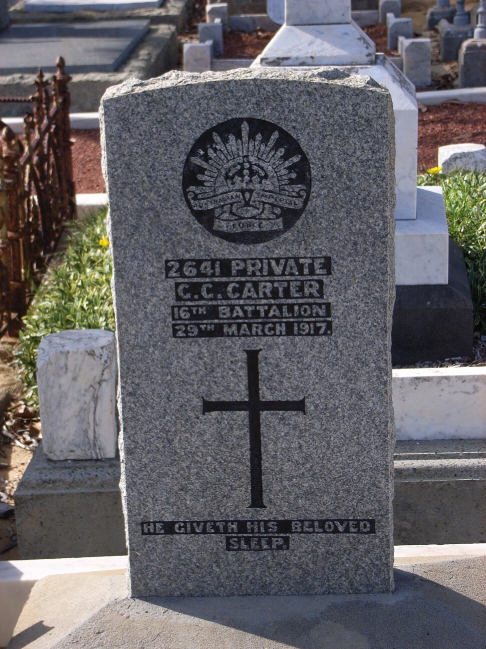 Geoff arrived at Fremantle on the 25th November 1916 and was met by his family though he was taken straight to No.8 Australian General Hospital in South Terrace Fremantle. This would be Geoff’s final home as he spent the next four months here his condition slowly deteriorating, and he died on the 29th March 1917. The official cause being Fractured spine, paraplegia and heart failure. Geoff was buried in Fremantle Cemetery Plot CE.AA.16. With two sons now dead and a third, No.6015 Pte Phillip Grant Carter in France with the 11th Battalion & 3rd Light Railway Operating Company, Mrs. Carter would have been an object of much sympathy.