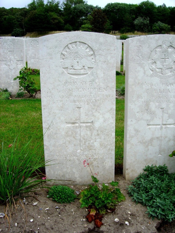 Due to his not having a regimental number he did not receive many letters from home due to always being on the move with his work in the hospital transports. His mother would receive a pension of 2 pounds per fortnight after his death. His brother Francis William Chegwidden served in the AAMC returned home at war’s end.
