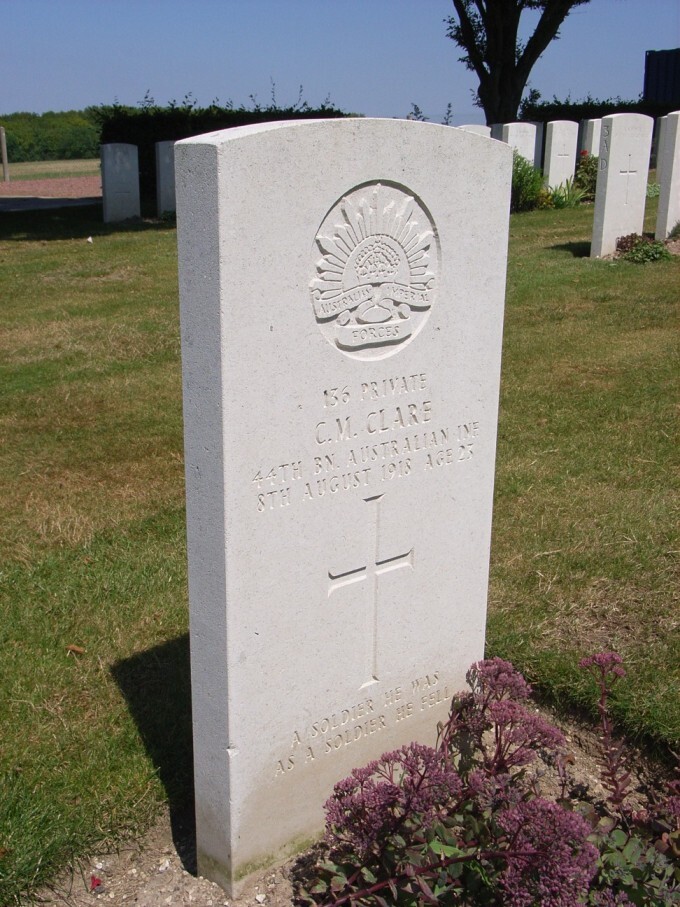 On August 8th 1918 the large offensive against the Germans was launched, the 44th Battalion advancing from Hamel. Casualties for the 44th were relatively light though during the early stages of the attack Clarence was shot and killed. His mates buried him just east of Hamel and marked his grave with a cross.