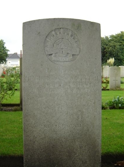 On the 5th January 1917 Hugh was assigned to the 338th Siege Battery then being put together in England. Hugh spent the next 6 months in England with this unit. On the 12th July 1917 Hugh left England and was sent to France to join the 55th Siege Battery of the 36th Heavy Artillery Group. Through July, August, September and October the Batteries of the 36th Heavy Artillery Group provided much fire support for the Third Battle of Ypres. On the 4th October 1917 Hugh was severely wounded by German counter battery fire. He was taken back to 2nd Anzacs Corps main dressing station where unfortunately he died of his wounds. He was buried in Ypres Prison Cemetery though this was later renamed as Ypres Reservoir Cemetery. Hugh lies in plot I.G.2.