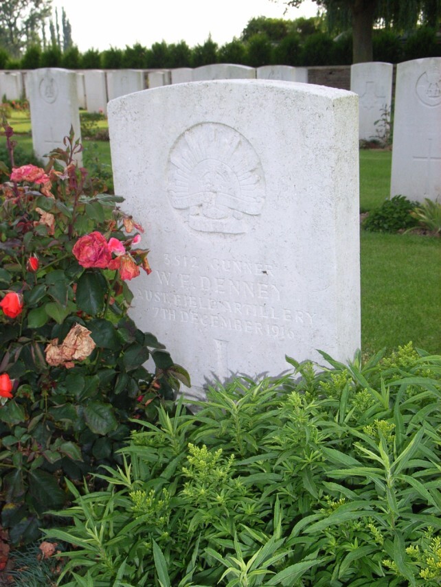 On the 6th June 1916 William embarked from Alexandria on the H.M.T. “Oriana” and made their way to France, arriving at Marseilles on the 13th June 1916. After arrival the 4th Division units were sent north to the region near Armentieres. On the 2nd July 1916 William transferred to a different unit when he was taken on strength of the 4th Heavy Trench Mortar Battery. William went on to serve with this unit through the Battle of the Somme in July, August and September 1916. After a short stint in Belgium the 4th Division returned to the Somme front in November 1916. On the 7th December 1916 while on a fatigue party between Flers and Delville Wood a stray shell fell and badly wounded William, while killing a Sapper Martin. A fellow Gunner reported that after William was hit he ran about a hundred yards and then fell but was picked up by stretcher bearers and evacuated. He was taken to a dressing station near Becordel where he unfortunately died of wounds the same day. Gunner William Denney was buried in Dartmoor Cemetery Becordel-Becourt in plot I.F.22.