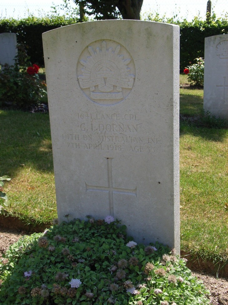 The 44th Battalion held their positions near Sailly-le-Sec and continued to resist the German attempts to advance. On the 7th April 1918 L/Cpl George Dornan was killed in action. He was buried about 800 yards east north east of Sailly-le-Sec at map reference 62D.J.29.B.8. After the war his grave was found and was reburied in Villers-Bretonneux Military Cemetery in plot XIII.D.7.