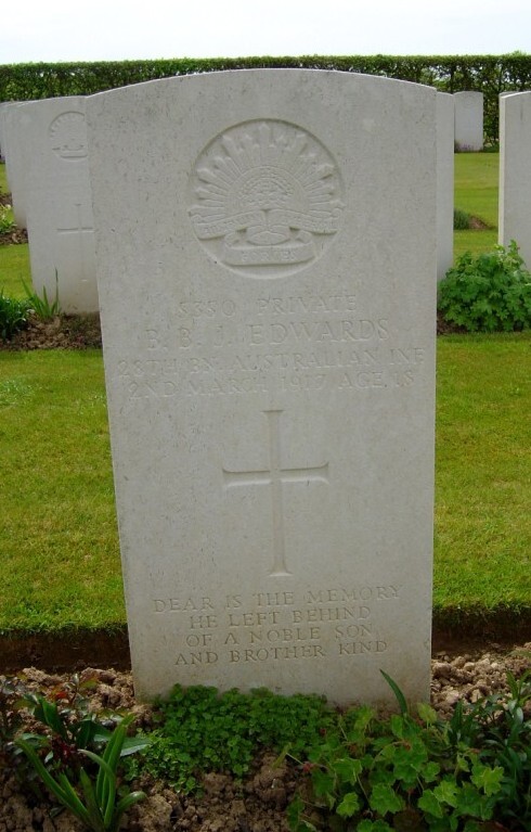 “I was one of the burying party at Le Sars on 3rd March 1917 and I assisted in burying the body of this man. He had been killed by a high explosive; the back of his head had been blown away. I took his disc and personal belongings from him and handed them over to Sgt. Major Jones of B Company, to which deceased belonged. We buried him in the sunken road about a hundred yards behind the line. It would be about 1000 yards along the road from Martinpuich. He was buried alone in a shell hole.” Another soldier stated that; “He was known among us as Curly Edwards.”