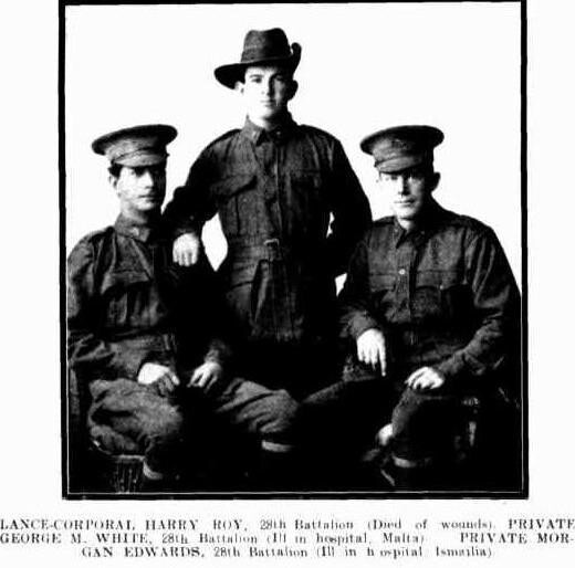 (Photo below - Three Fremantle soldiers of the 28th Battalion AIF – No.1576 L/Cpl Harry Roy died of wounds received at Gallipoli, No.1597 Cpl George White and No.1532 Pte Evan Morgan Edwards. Only George White returned home)