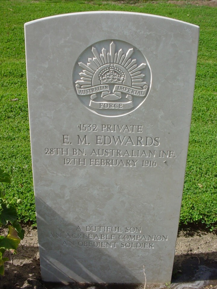 Evan remained with the 28th Battalion for the rest of their time at Gallipoli and left with them when they evacuated the peninsula. After a short period of time in Mudros; Evan returned to Egypt on the 16th January 1916. The battalion went into camp and commenced training for service in France. On the 31st January Evan was admitted to the 7th Field Ambulance with an ingrown toe nail though returned to the 28th Battalion on the 5th February. Almost immediately he was admitted to 7th Field Ambulance suffering from meningitis. He was evacuated to the 2nd Casualty Clearing Station where he was also diagnosed with Pneumonia. He was then admitted to the 1st Australian Stationary Hospital where his condition was listed as “dangerously ill”. Evan spent the next five days here where his condition slowly deteriorated. On the 12th February 1916 he died and was buried at Ismailia War Memorial Cemetery Egypt in Plot B.13 in a service conducted by Chaplain Captain W. Stevens.