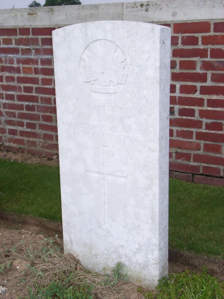 Shortly after this the 48th Battalion made their way south to the Somme front where they would take part in the Battle for Pozieres and Mouquet Farm. George was temporarily assigned to duty at the 12th Brigade Headquarters though rejoined the 48th Battalion on the 11th August 1916. Three days later on the 14th August 1916 George was killed by shellfire. His body was recovered and was buried at Sunken Road Cemetery in Contalmaison France in plot I.A.14.