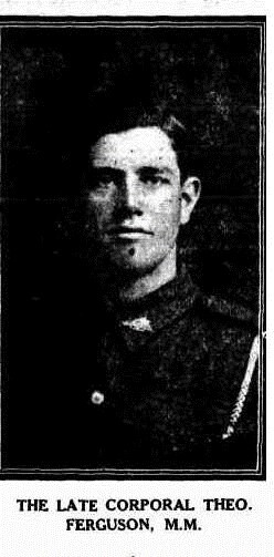 Well Mr Ferguson, I’m stuck, and here’s the truth. Theo was killed on Sunday evening, the 24th June. He with his company went out to occupy a position in front of our then existing front line, they succeeded, bombing out the Huns, and digging themselves in, forming a trench from shell hole to shell hole. Then a shell came, and Theo received his call, instantaneous I believe…He was well liked by all he came in contact with. He had no fear of death or anything else, and always did his duty cheerfully, and helped others in any way he could. I am enclosing a typed slip informing him that he had been previously awarded the Military Medal in Messines, and I should like to add that he won it more than once by his devotion to duty and zeal in carrying out any order entrusted to him. Our band wishes me to express to Theo’s father and mother, their sincere sympathy and to state that we have not only lost a valuable member but also a true friend to all of us.”