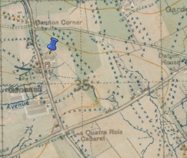 Theo was buried behind the line about 30 yards on the left of a communication trench called ‘Bowen Avenue’ with 2067 Private George Barr who had been killed by the same shell. They had small crosses put up to mark the spot at map reference 28.O.35.a.6.3.