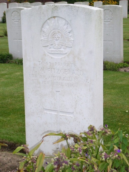 After being disembarked the men were put onto trains and sent to the north of France where they took up front line positions for the first time. They were in positions just to the south of Armentieres in an area known as Fleurbaix. Here they gained their first experience of the Western Front and through April and May learnt the ways of warfare in France. On the 30th May 1916 the 11th Battalion were on the receiving end of a German trench raid and suffered heavy casualties. Francis survived this but was not so fortunate a week later on the 7th June when the Germans launched a fierce bombardment on the 11th Battalion’s trenches. Francis was killed in action. He was taken back and buried at Rue Petillon Military Cemetery with the burial service conducted by Reverend John Fahey of the 3rd Brigade. Francis Fitzgerald lies in plot I.J.44.
