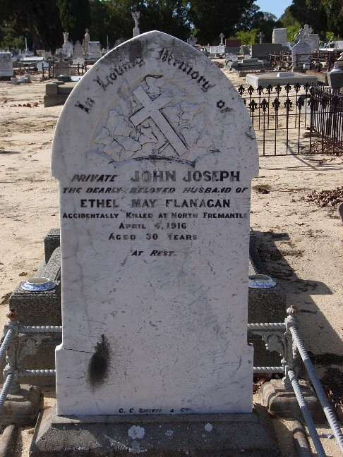 Private John Joseph Flanagan was buried in the Roman Catholic section of Fremantle Cemetery. His wife left Fremantle and went to live in Albany WA.