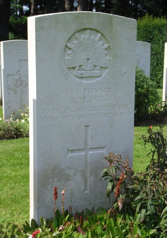 His brother George Ing was fortunate to survive the war. He was an original 28th Battalion soldier and served with them at Gallipoli. In early 1916 he transferred to the 14th Machine Gun Company and saw action at Fromelles in July 1916 and Bullecourt in May 1917 before being commissioned in July 1917. He was wounded the same month but returned in time to take part in the Third Battle of Ypres where he was again wounded. He returned to the 14th MGC in February 1918 and saw action with them till the end of the war. He was Mentioned in Despatches for bravery during the capture of Peronne in September 1918. After returning to WA George married Jessie Sargent in Beaconsfield in 1923. In World War Two George continued to serve with the Home based Army and the 10th Garrison Battalion (W27738)