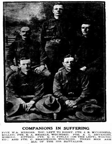 (Photo below - Of the five soldiers in the photo, only Private Finlay & Braidwood survived the war. McConnell and Devenish died at Gallipoli while Ernest Hearle, though wounded at Gallipoli, returned and served with the 3rd Machine Gun Company AIF in France. He was killed at Bullecourt in May 1917.)