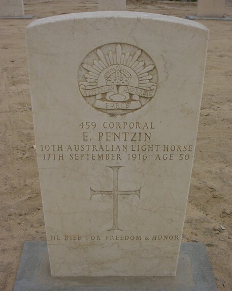 On the 17th September 1916 the 10th Light Horse at Hod Amara was bombed and machine gunned by the German air force. There was only one death by the machine gun fire and that was Ernie Pentzin. He was initially buried in Mazar Cemetery but after the war was moved to Kantara War Memorial Cemetery where he lies in plot F.43. Ernie was 50 years old at the time of his death.