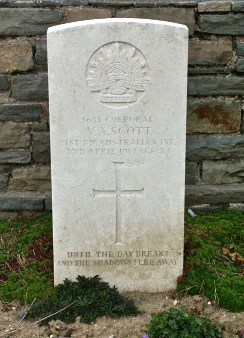 Corporal Vernon Scott was buried at Bapaume Australian Cemetery in plot A.19.