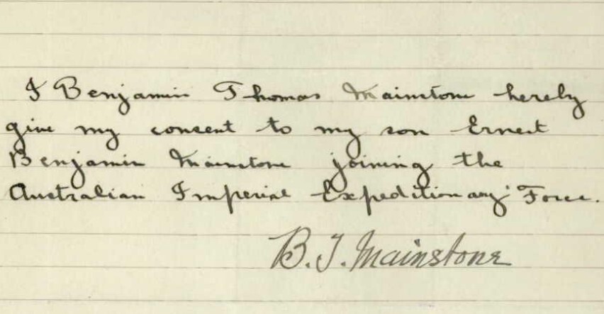 Benjamin Mainstone signed the consent form which Ernie took with him to the Recruitment Office at Blackboy Hill Camp which is where he enlisted. Ernie was accepted as fit for service, with the medical examiner recording Ernie's physical attributes as;