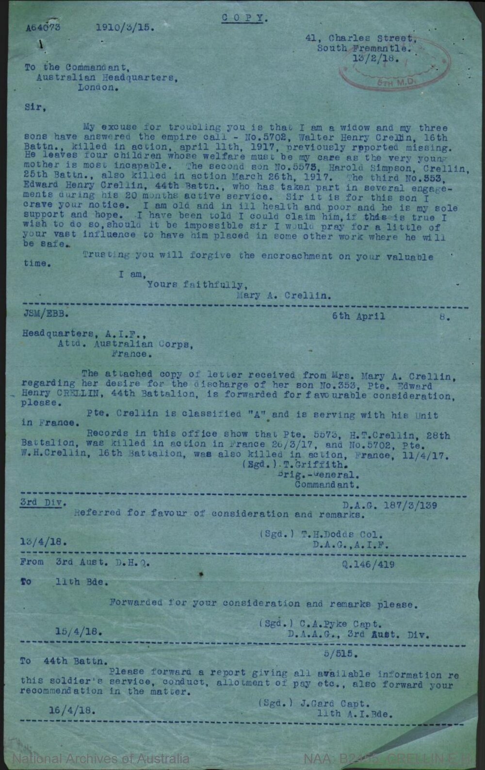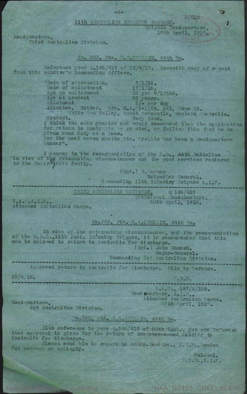 353 Private Edward Henry Crellin - 44th Battalion AIF