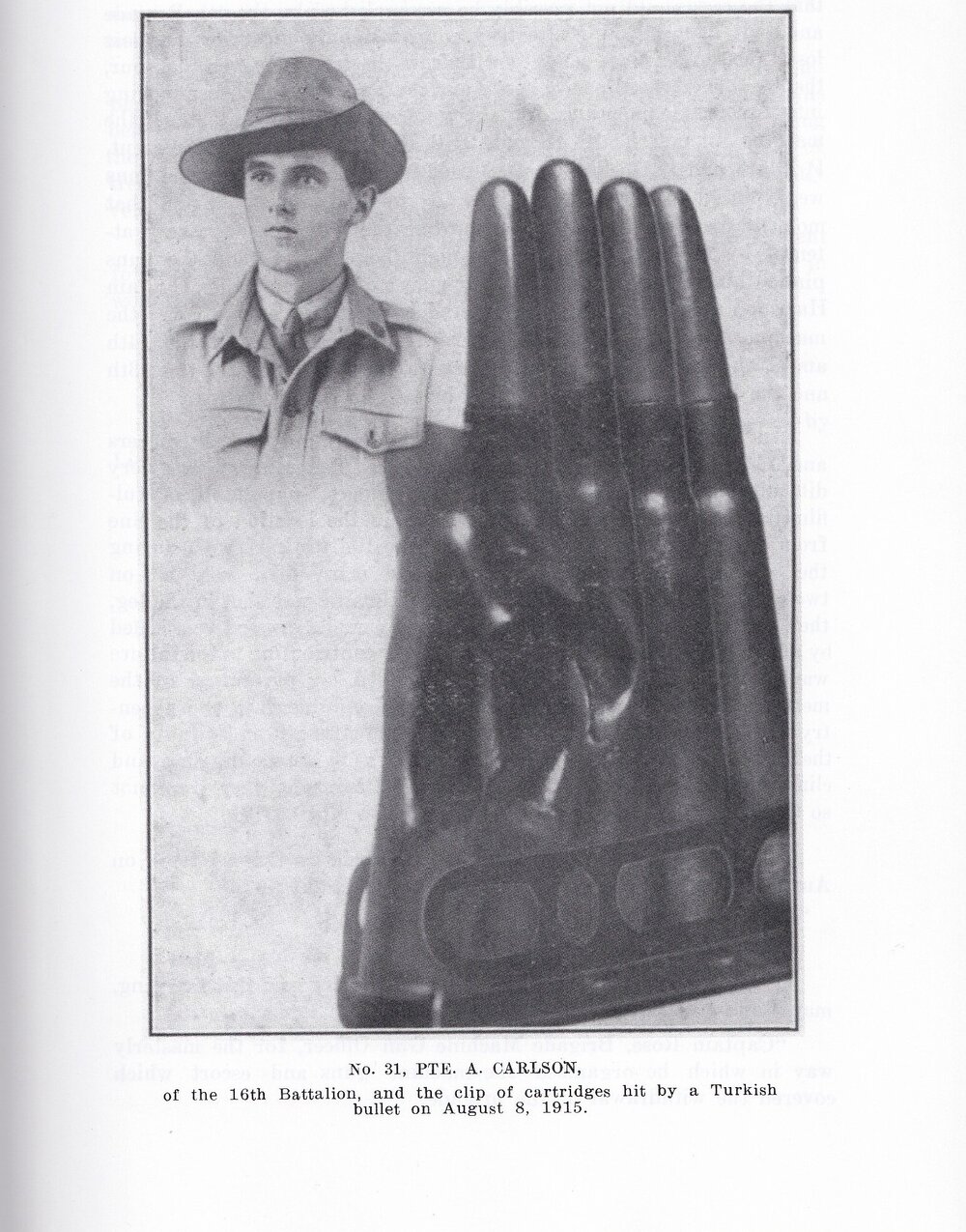 During the initial advance on the 8th August Aage was hit by a Turkish bullet however the bullet only dented the bullet cartridge case (photo above from 16th Bn history). Two days later on the 10th August Aage was wounded when a bullet hit him through the right arm.