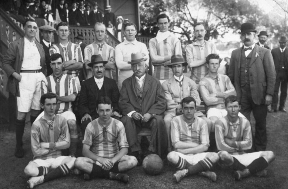 Photo below - James Durward - three left in back - pictured in 1914 at East Fremantle Oval after his Fremantle Caledonians team beat the local English team 1-0. James scored the winning goal.