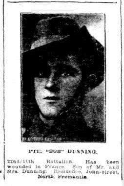 Robert James Dunning was born in North Fremantle WA in 1898 to William and Eva Dunning. Robert was one of 15 siblings, all of whom were born in North Fremantle; William (1897), Albert (1900), Elizabeth (1902), Eva (1904), Agnes (1905), Harry (1907), Charles (1908), Dorothy (1909), Rita (1909), George (1911), Margaret (1913), Percival (1914), David (1918) and Daisy (1922).