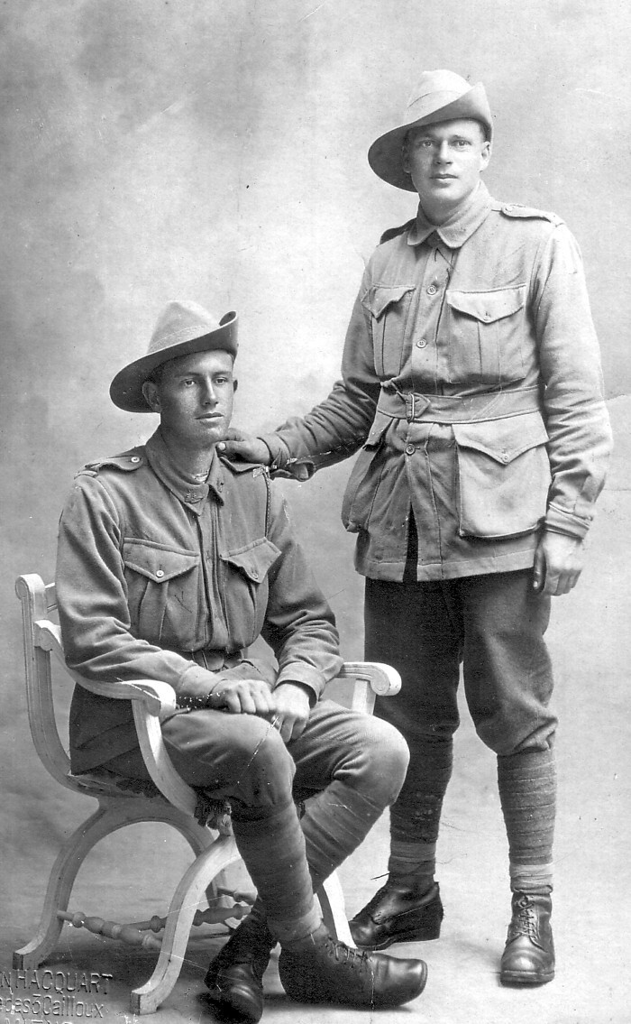 William was taken on strength of the 32nd Battalion on the 6th April 1917. (Clarrie Monkhouse pictured standing with his mate Will Duffield (sitting) they were both transferred to the 32nd Battalion).