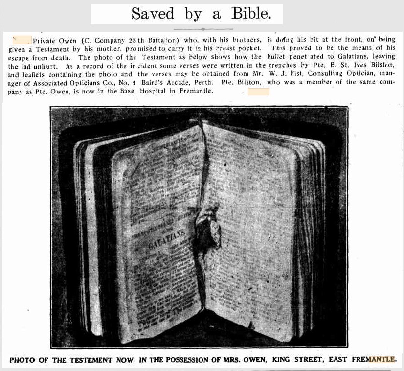 Griffith had a close shave with being killed when a Turkish bullet hit the bible he was carrying in his top pocket. (Article below from Camp Chronicle published 20th September 1917)