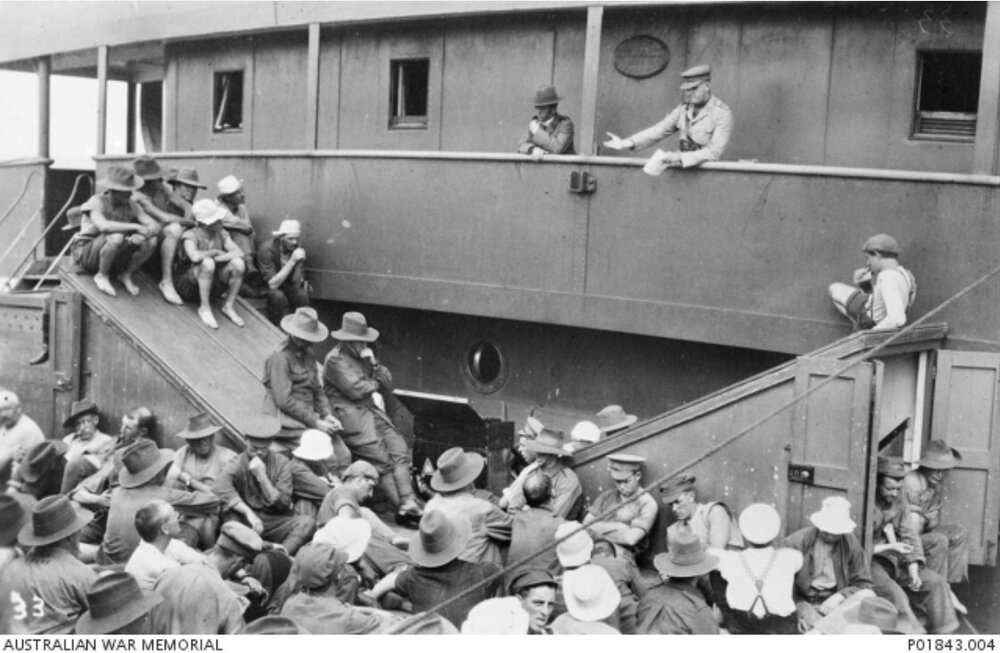 (Photo Below from the Australian War Memorial of Reginald Burchell giving a talk to the soldiers aboard the Shropshire.)